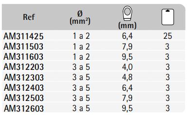 | Oeillet | 1 a 2 6,4 25, 1 a 2 7,9 3, 1 a 2 9,5 3, 3 a 5 4,0 3, 3 a 5 4,8 3, 3 a 5 6,4 3, 3 a 5 7,9 3, 3 a 5 9,5 3 |
