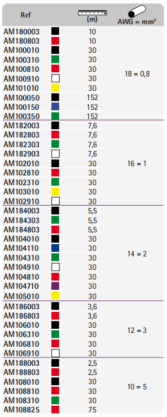 | Dimension | Blanc 30 12 = 3, Blanc 30 14 = 2, Blanc 30 16 = 1, Blanc 30 18 = 0,8, Blanc 7.6 16 = 1, Bleu 152 18 = 0,8, Bleu 30 14 = 2, Jaune 30 14 = 2, Jaune 30 16 = 1, Jaune 30 18 = 0,8, Noir 10 18 = 0,8, Noir 152 18 = 0,8, Noir 2.5 10 = 5, Noir 3.6 12 = 3, Noir 30 10 = 5, Noir 30 12 = 3, Noir 30 14 = 2, Noir 30 16 = 1, Noir 30 18 = 0,8, Noir 5.5 14 = 2, Noir 7.6 16 = 1, Rouge 10 18 = 0,8, Rouge 2.5 10 = 5, Rouge 3.6 12 = 3, Rouge 30 10 = 5, Rouge 30 12 = 3, Rouge 30 14 = 2, Rouge 30 16 = 1, Rouge 30 18 = 0,8, Rouge 5.5 14 = 2, Rouge 7.6 16 = 1, Rouge 75 10 = 5, Vert 152 18 = 0,8, Vert 30 10 = 5, Vert 30 12 = 3, Vert 30 14 = 2, Vert 30 16 = 1, Vert 30 18 = 0,8, Vert 5.5 14 = 2, Vert 7.6 16 = 1, Violet 30 14 = 2 |