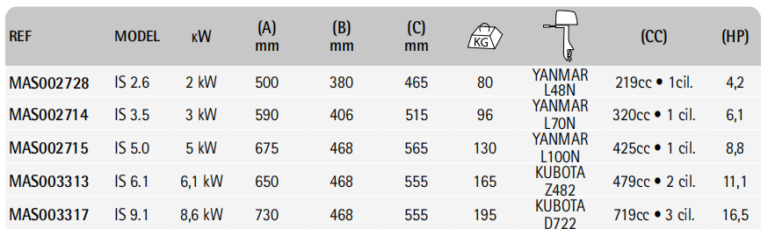 | Poids | IS 2.6 2 kW 500 380 465 80 YANMAR L48N 219cc • 1cil. 4,2, IS 3.5 3 kW 590 406 515 96 YANMAR L70N 320cc • 1 cil. 6,1, IS 5.0 5 kW 675 468 565 130 YANMAR L100N 425cc • 1 cil. 8,8, IS 6.1 6,1 kW 650 468 555 165 KUBOTA Z482 479cc • 2 cil. 11,1, IS 9.1 8,6 kW 730 468 555 195 KUBOTA D722 719cc • 3 cil. 16,5 |